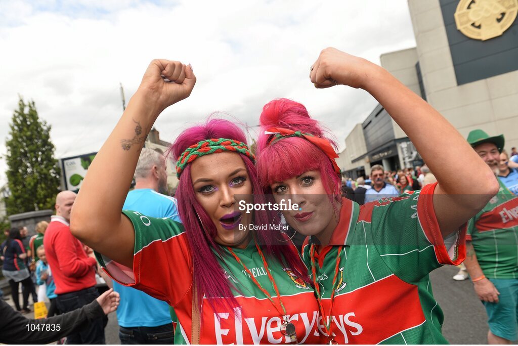 30 August 2015; Mayo supporters Natalie, left, and Marsella Reilly, from Belmullet, Co. Mayo, on their way to the game. GAA Football All-Ireland Senior Championship, Semi-Final, Dublin v Mayo, Croke Park, Dublin. Picture credit: David Maher / SPORTSFILE