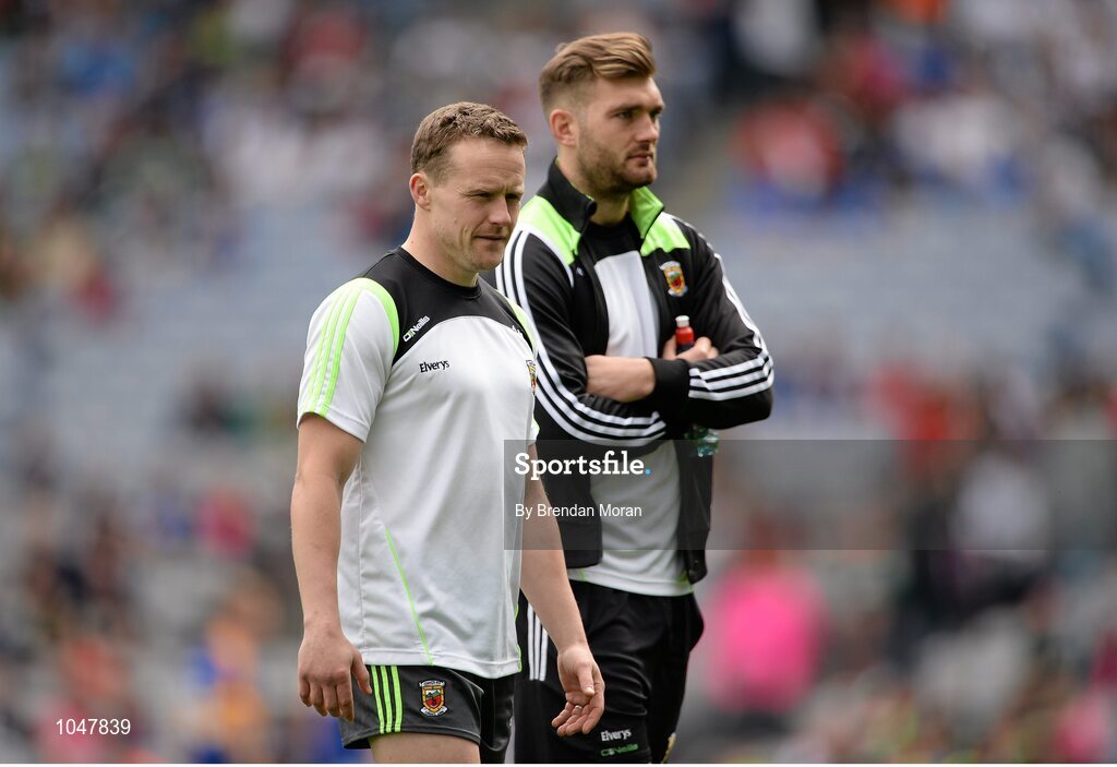 30 August 2015; Andy Moran, left, and Aidan O'Shea, Mayo, walk the pitch before the game. GAA Football All-Ireland Senior Championship, Semi-Final, Dublin v Mayo, Croke Park, Dublin. Picture credit: Brendan Moran / SPORTSFILE