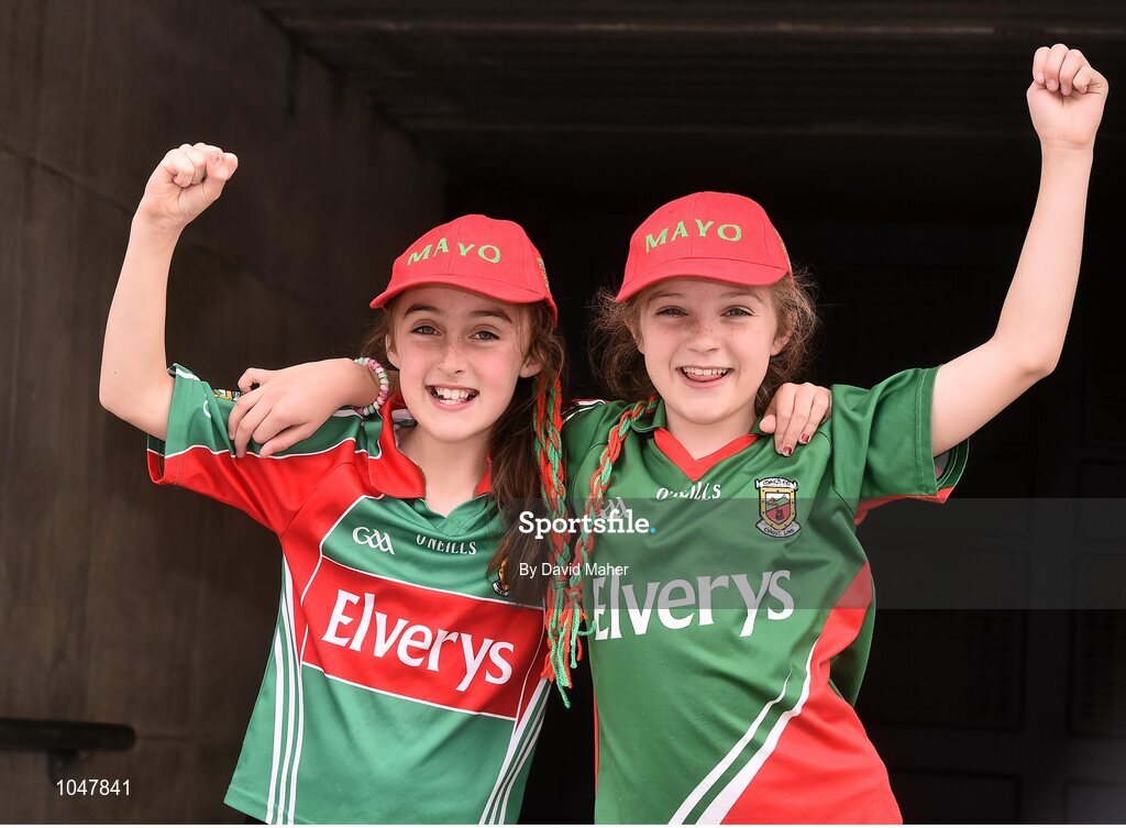 30 August 2015; Mayo supporters Caoimhe, left, age 9, and her sister Rosin Howley, age 10 from Foxford, Co. Mayo. GAA Football All-Ireland Senior Championship, Semi-Final, Dublin v Mayo, Croke Park, Dublin. Picture credit: David Maher / SPORTSFILE