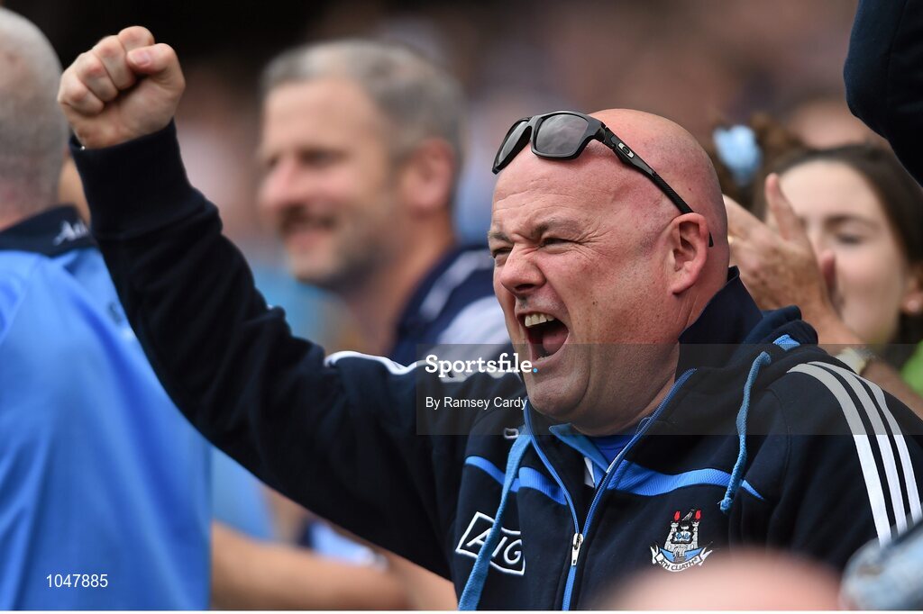 30 August 2015; A Dublin supporter celebrates after Dublin's Diarmuid Connolly scored a goal from the penalty spot. GAA Football All-Ireland Senior Championship, Semi-Final, Dublin v Mayo, Croke Park, Dublin. Picture credit: Ramsey Cardy / SPORTSFILE