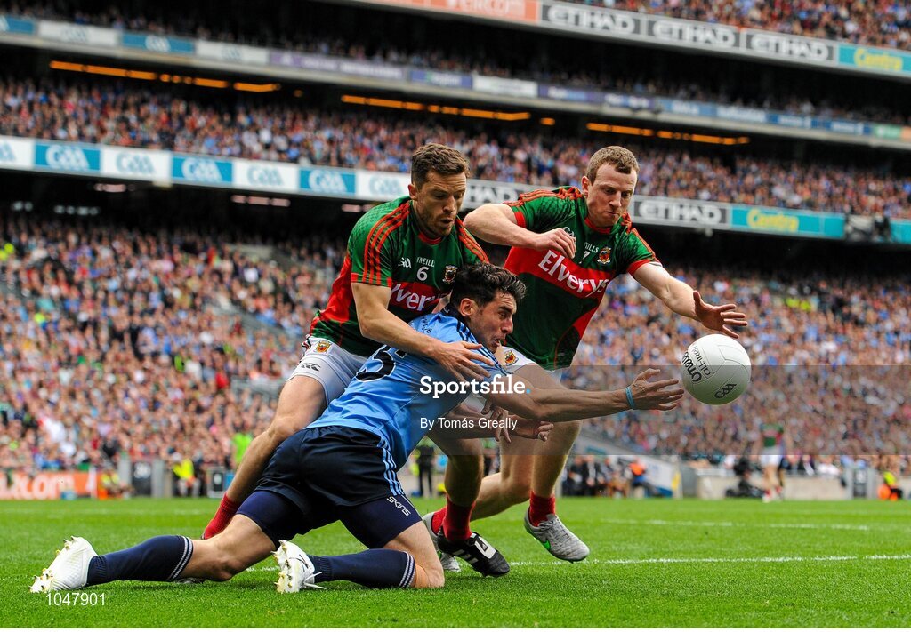 30 August 2015; Bernard Brogan, Dublin, in action against Chris Barrett and Colm Boyle, right, Mayo. GAA Football All-Ireland Senior Championship Semi-Final, Dublin v Mayo, Croke Park, Dublin. Picture credit: Tomás Greally / SPORTSFILE