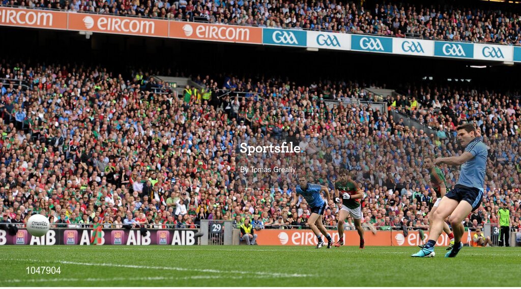 30 August 2015; Dublin's Diarmuid Connolly scores a penalty past Mayo goalkeeper Rob Hennelly in the fifth minute. GAA Football All-Ireland Senior Championship, Semi-Final, Dublin v Mayo, Croke Park, Dublin. Picture credit: Tomás Greally / SPORTSFILE