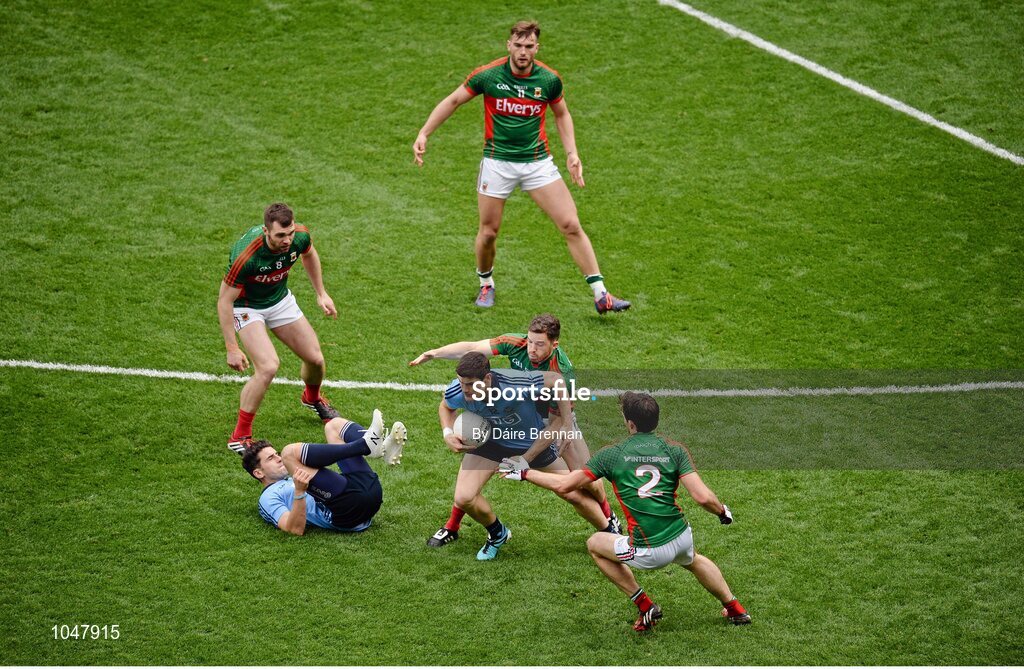 30 August 2015; Diarmuid Connolly, right, and Bernard Brogan, Dublin, in action against Mayo players, left to right, Séamus O'Shea, Aidan O'Shea, Chris Barrett, and Ger Cafferkey. GAA Football All-Ireland Senior Championship, Semi-Final, Dublin v Mayo, Croke Park, Dublin. Picture credit: Dáire Brennan / SPORTSFILE