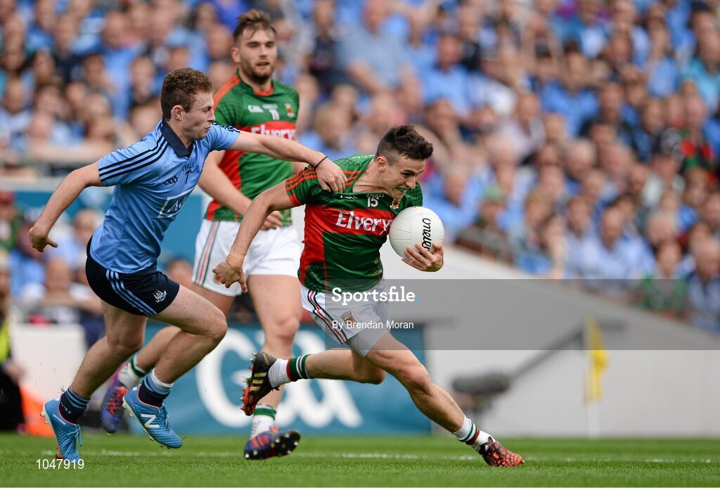 30 August 2015; Jason Doherty, Mayo, in action against Jack McCaffrey, Dublin. GAA Football All-Ireland Senior Championship, Semi-Final, Dublin v Mayo, Croke Park, Dublin. Picture credit: Brendan Moran / SPORTSFILE