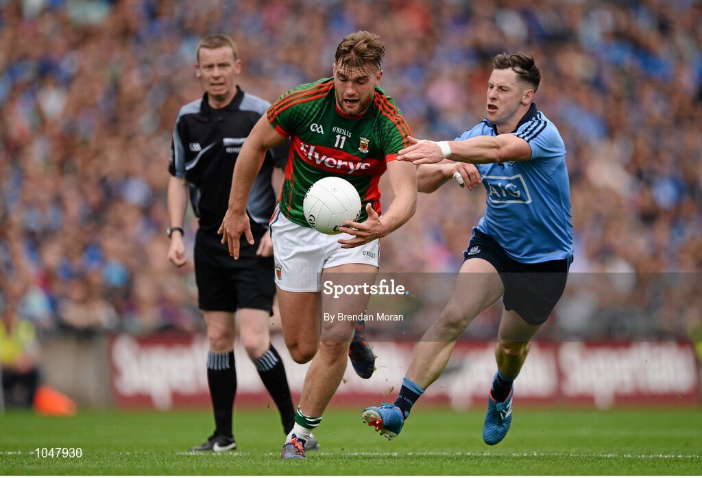 30 August 2015; Aidan O'Shea, Mayo, in action against Philly McMahon, Dublin. GAA Football All-Ireland Senior Championship, Semi-Final, Dublin v Mayo, Croke Park, Dublin. Picture credit: Brendan Moran / SPORTSFILE