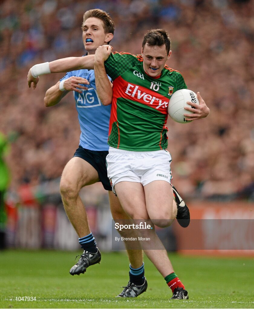 30 August 2015; Diarmuid O'Connor, Mayo, in action against Michael Fitzsimons, Dublin. GAA Football All-Ireland Senior Championship, Semi-Final, Dublin v Mayo, Croke Park, Dublin. Picture credit: Brendan Moran / SPORTSFILE