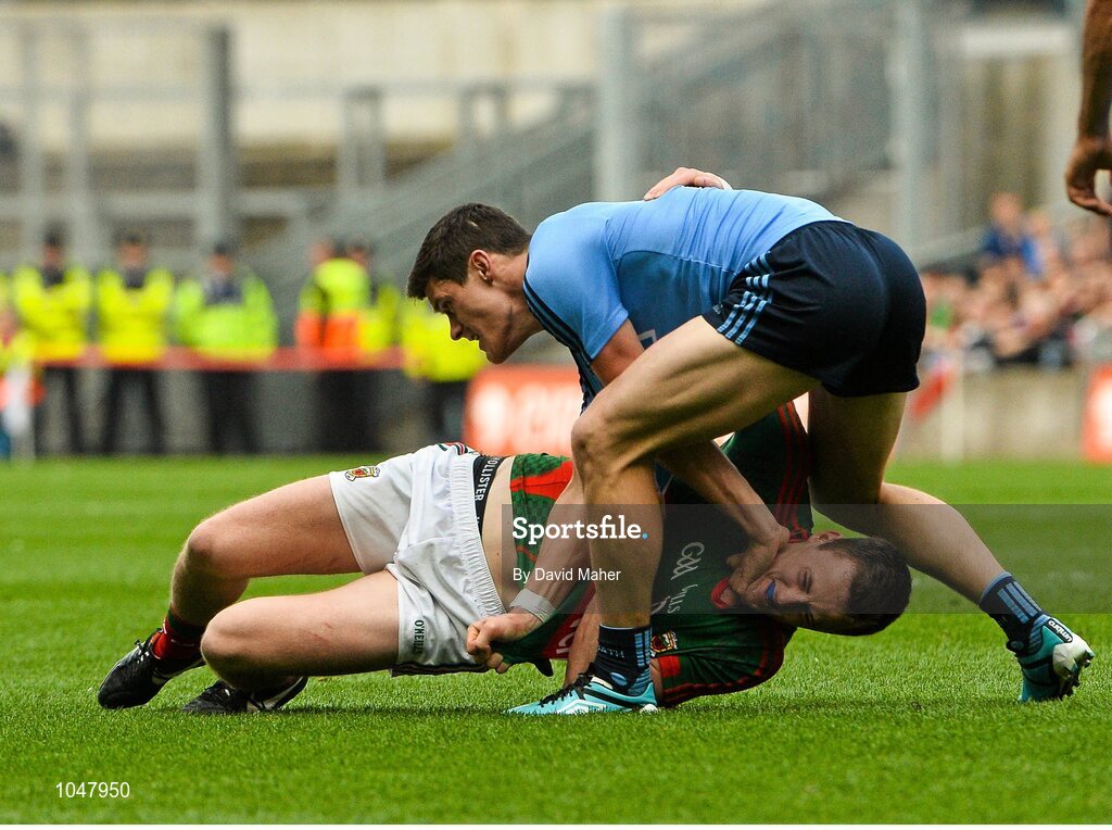 30 August 2015; Diarmuid Connolly, Dublin, tussles with Diarmuid O'Connor, Mayo. GAA Football All-Ireland Senior Championship, Semi-Final, Dublin v Mayo, Croke Park, Dublin. Picture credit: David Maher / SPORTSFILE