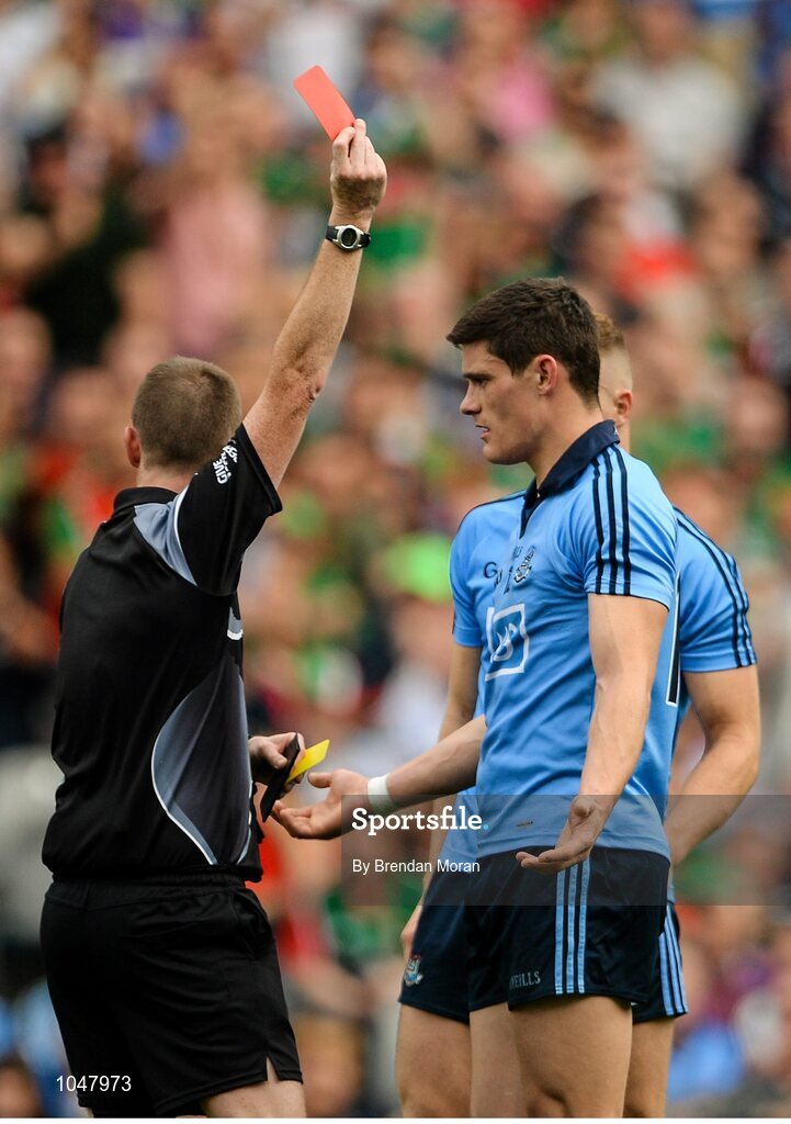 30 August 2015; Match referee Joe McQuillan shows a red card to Dublin's Diarmuid Connolly in the final stages of the game. GAA Football All-Ireland Senior Championship, Semi-Final, Dublin v Mayo, Croke Park, Dublin. Picture credit: Brendan Moran / SPORTSFILE
