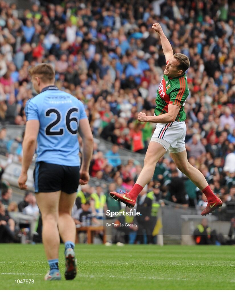 30 August 2015; Andy Moran, Mayo, celebrates scoring his side's equalising point. GAA Football All-Ireland Senior Championship, Semi-Final, Dublin v Mayo, Croke Park, Dublin. Picture credit: Tomás Greally / SPORTSFILE