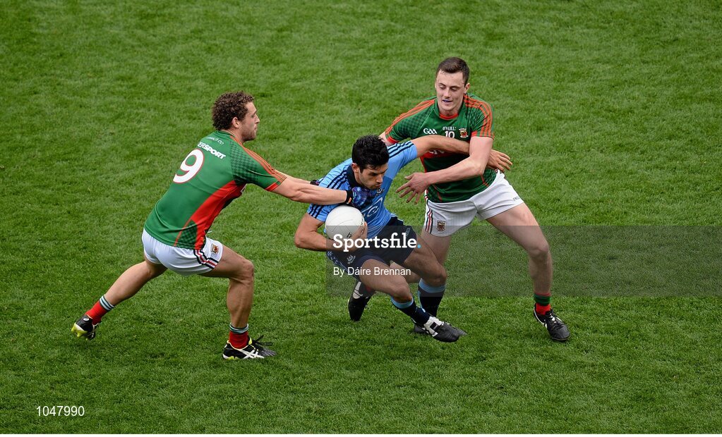 30 August 2015; Cian O'Sullivan, Dublin, in action against Tom Parsons, left, and Diarmuid O'Connor, Mayo. GAA Football All-Ireland Senior Championship, Semi-Final, Dublin v Mayo, Croke Park, Dublin. Picture credit: Dáire Brennan / SPORTSFILE