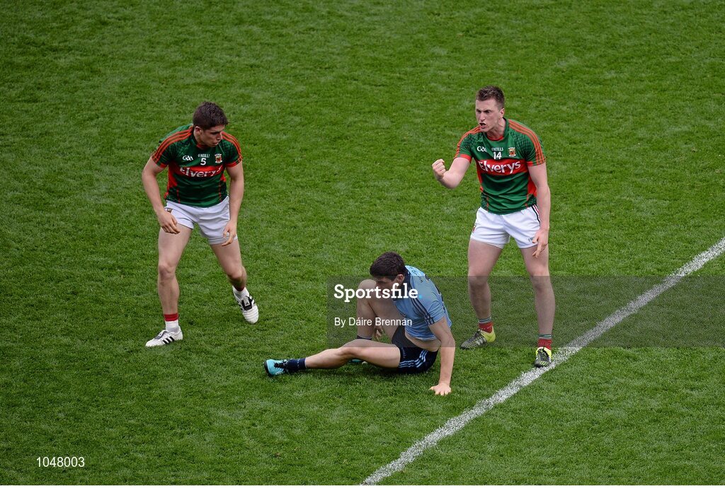 30 August 2015; Cillian O'Connor, Mayo, signals to the linesman that Diarmuid Connolly, Dublin, used his fist during an altrication with Lee Keegan, Mayo. Connolly subsequently received a red card for this incident. GAA Football All-Ireland Senior Championship, Semi-Final, Dublin v Mayo, Croke Park, Dublin. Picture credit: Dáire Brennan / SPORTSFILE