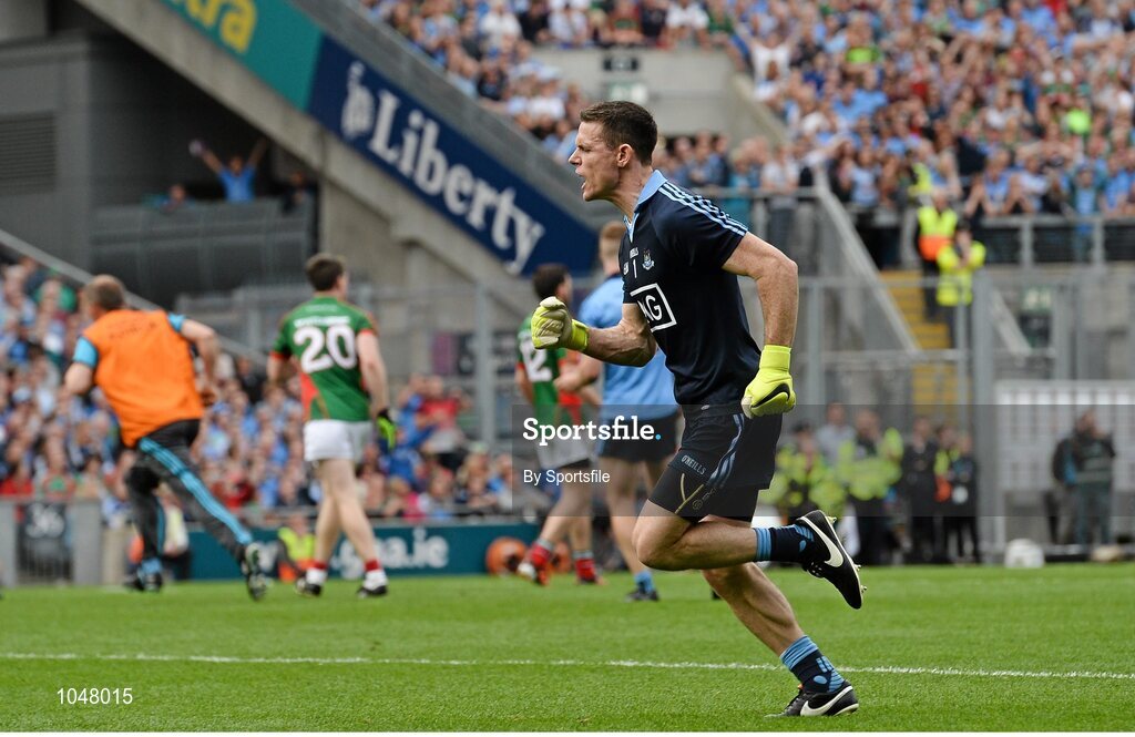 30 August 2015; Dublin goalkeeper Stephen Cluxton runs back to his line after missing a point late on in the game. GAA Football All-Ireland Senior Championship, Semi-Final, Dublin v Mayo, Croke Park, Dublin. Photo by Sportsfile