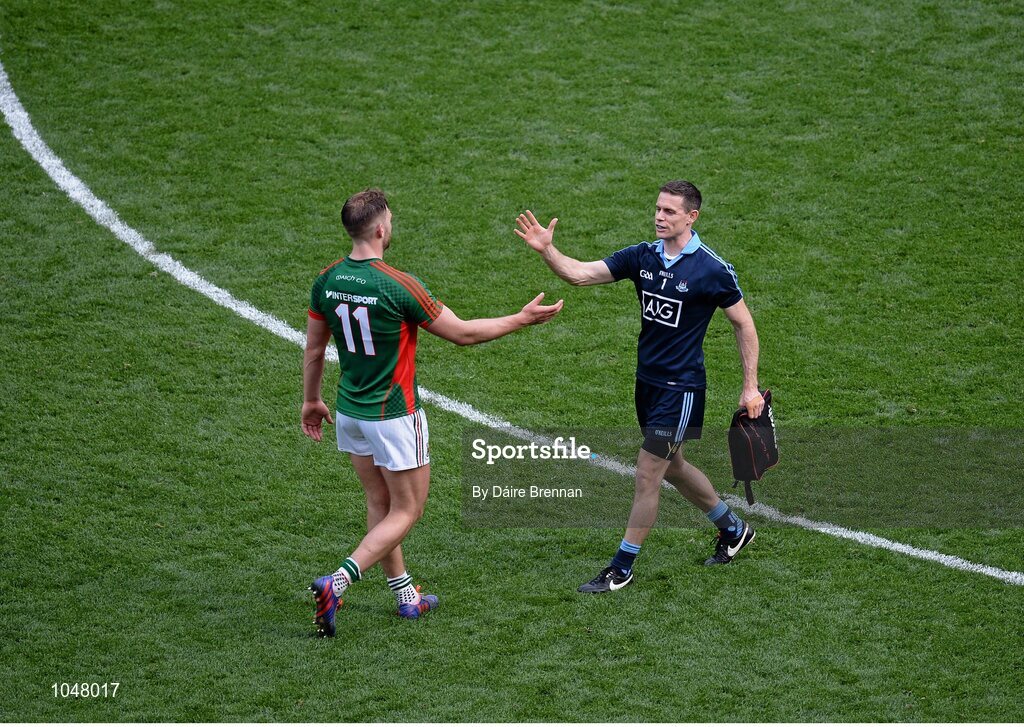 30 August 2015; Stephen Cluxton, Dublin, and Aidan O'Shea, Mayo, shake hands after the game. GAA Football All-Ireland Senior Championship, Semi-Final, Dublin v Mayo, Croke Park, Dublin. Picture credit: Dáire Brennan / SPORTSFILE