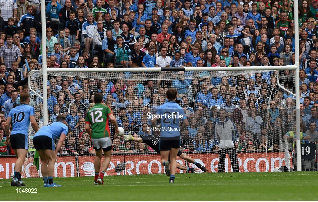 30 August 2015; Dublin goalkeeper Stephen Cluxton is beaten by this penalty kicked by Cillian O'Connor. GAA Football All-Ireland Senior Championship, Semi-Final, Dublin v Mayo, Croke Park, Dublin. Picture credit: Ray McManus / SPORTSFILE