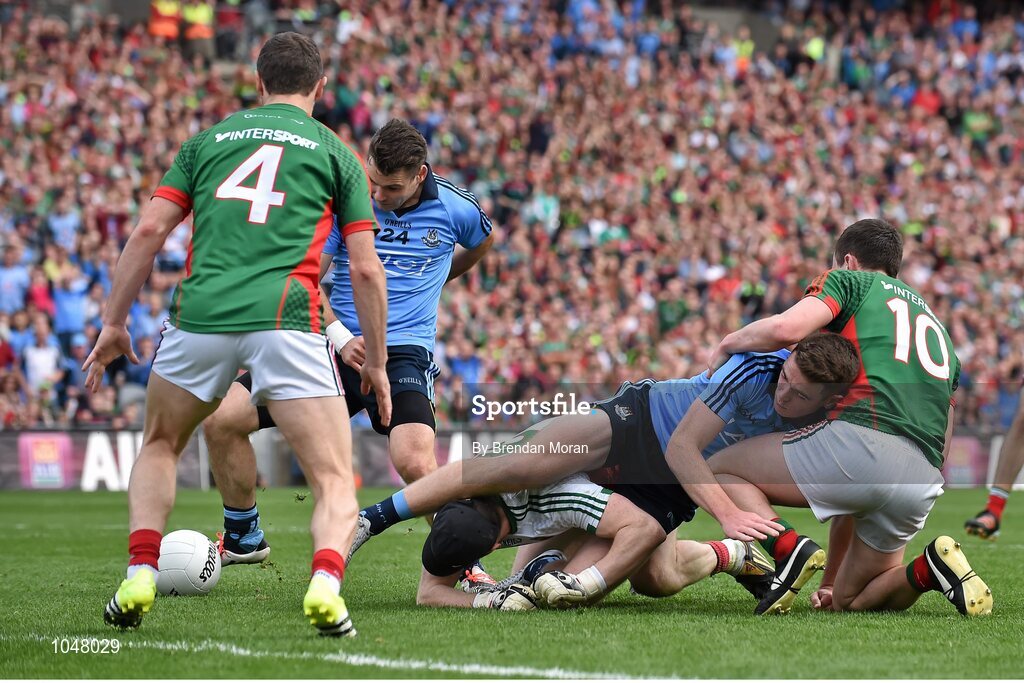 30 August 2015; Kevin McManamon, 2nd from left, Dublin, scores his side's second goal of the game. GAA Football All-Ireland Senior Championship, Semi-Final, Dublin v Mayo, Croke Park, Dublin. Picture credit: Brendan Moran / SPORTSFILE