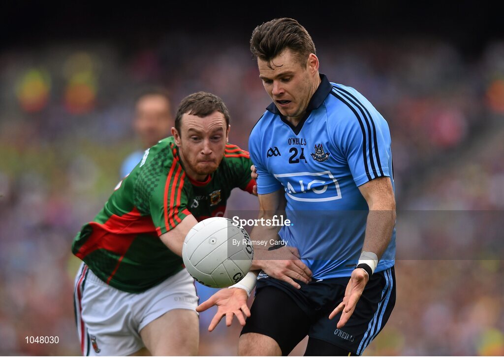 30 August 2015; Kevin McManamon, Dublin, in action against Keith Higgins, Mayo. GAA Football All-Ireland Senior Championship, Semi-Final, Dublin v Mayo, Croke Park, Dublin. Picture credit: Ramsey Cardy / SPORTSFILE