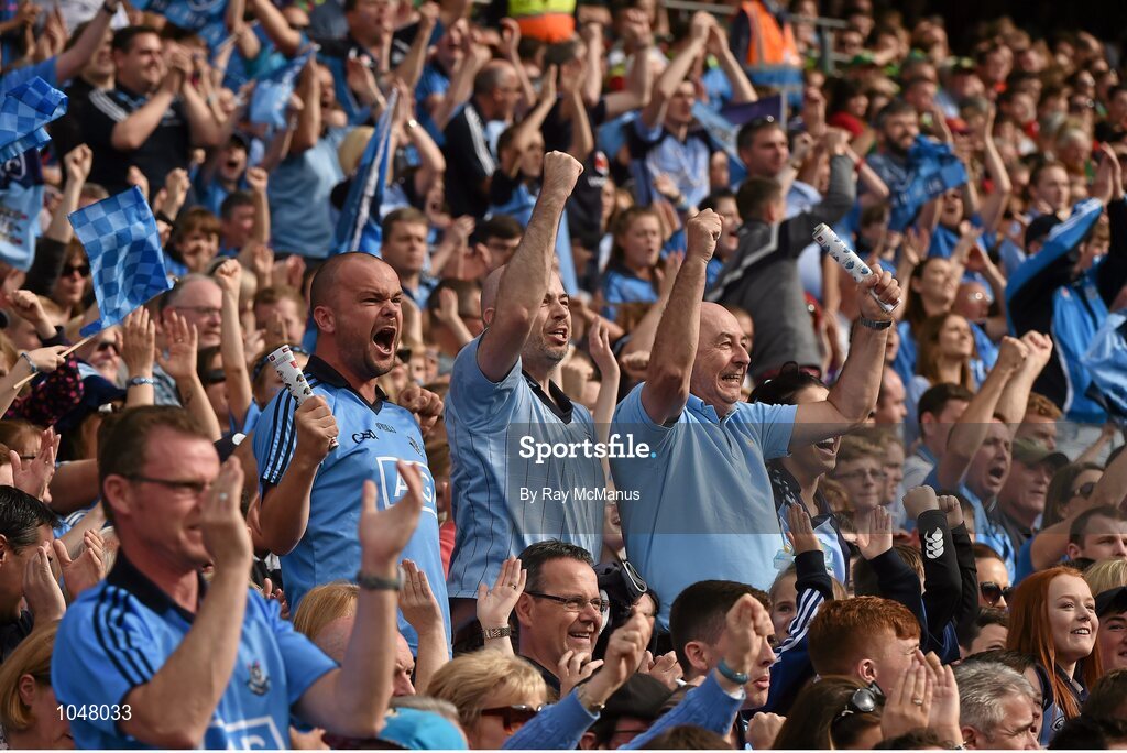 30 August 2015; Dublin supporters, in the Cusack Stand, celebrate a score. GAA Football All-Ireland Senior Championship, Semi-Final, Dublin v Mayo, Croke Park, Dublin. Picture credit: Ray McManus / SPORTSFILE