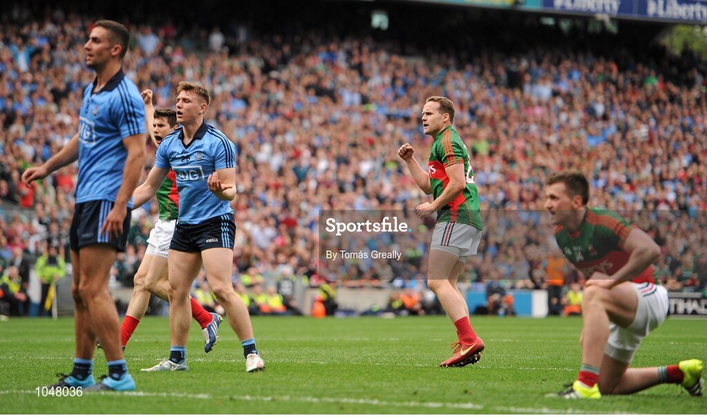 30 August 2015; Andy Moran, Mayo, watches his point go over to level the game. GAA Football All-Ireland Senior Championship, Semi-Final, Dublin v Mayo, Croke Park, Dublin. Picture credit: Tomás Greally / SPORTSFILE