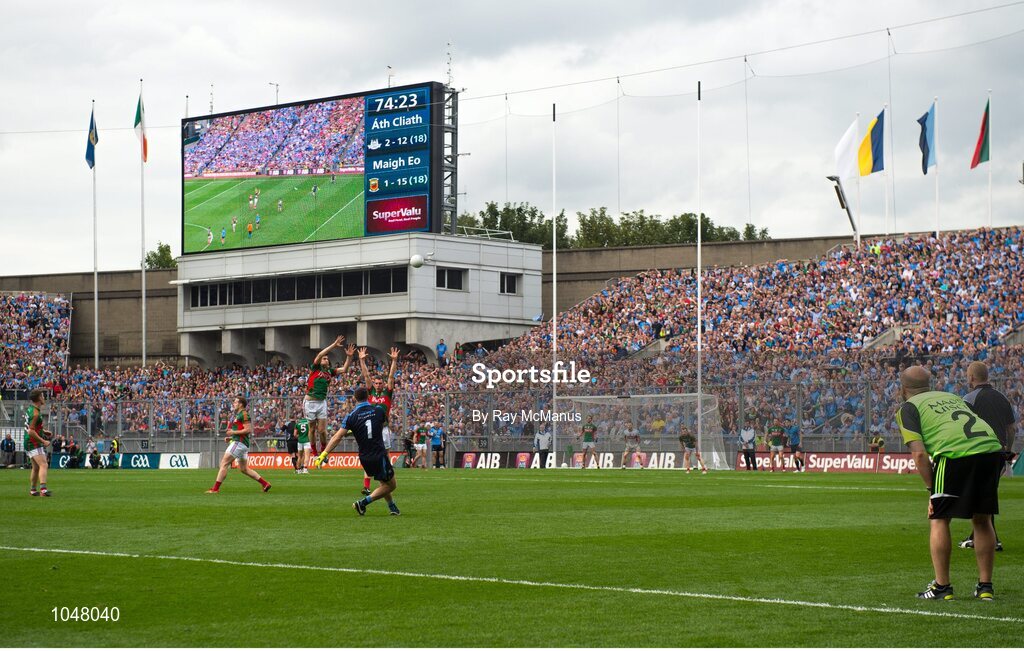 30 August 2015; Dublin goalkeeper Stephen Cluxton kicks a free, in the final minutes, wide. GAA Football All-Ireland Senior Championship, Semi-Final, Dublin v Mayo, Croke Park, Dublin. Picture credit: Ray McManus / SPORTSFILE