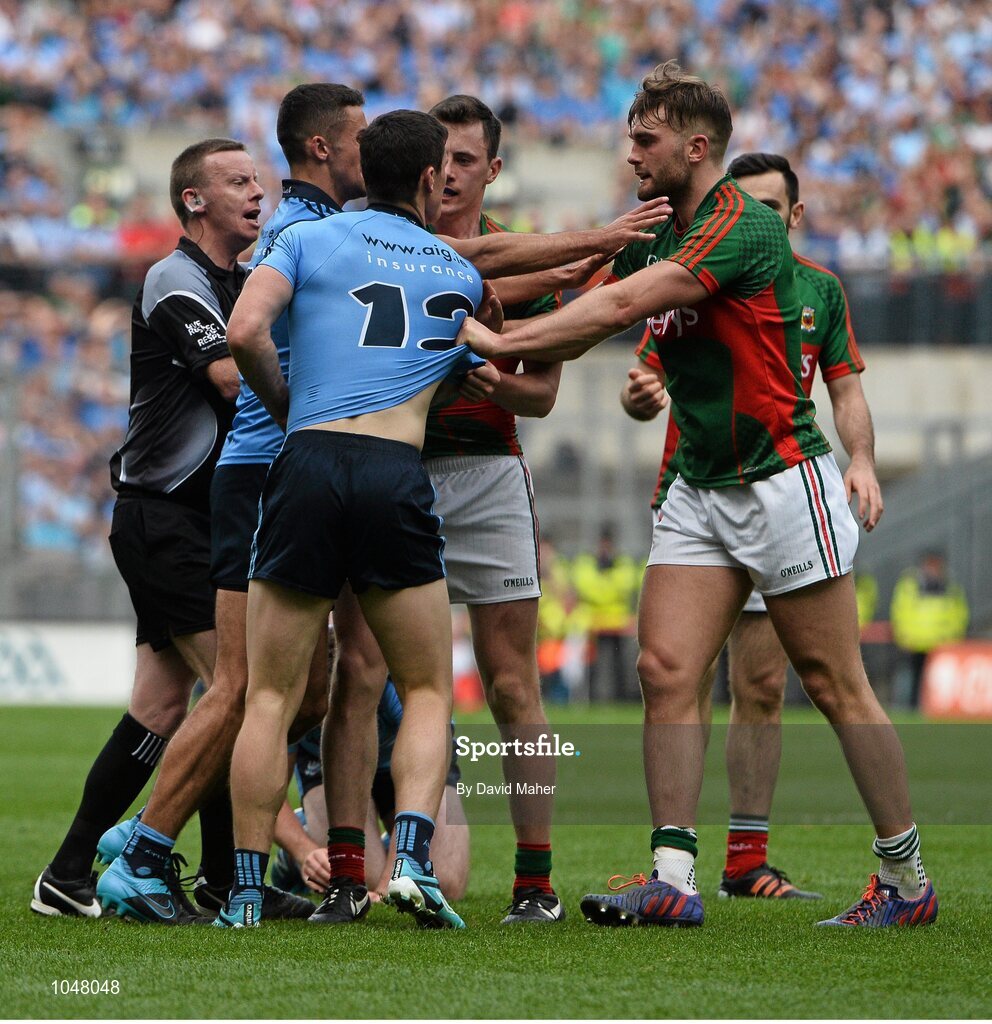 30 August 2015; Aidan O'Shea, Mayo, and Diarmuid Connolly, Dublin, clash during the game. GAA Football All-Ireland Senior Championship, Semi-Final, Dublin v Mayo, Croke Park, Dublin. Picture credit: David Maher / SPORTSFILE