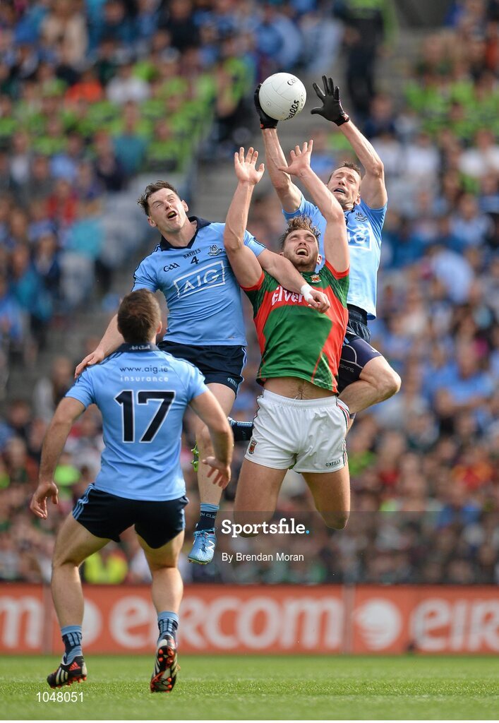 30 August 2015; Denis Bastick, Dublin, fields a kickout ahead of team-mate Philly McMahon, left, and Aidan O'Shea, Mayo. GAA Football All-Ireland Senior Championship, Semi-Final, Dublin v Mayo, Croke Park, Dublin. Picture credit: Brendan Moran / SPORTSFILE