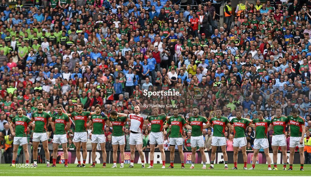 30 August 2015; The Mayo team during the National Anthem. GAA Football All-Ireland Senior Championship, Semi-Final, Dublin v Mayo, Croke Park, Dublin. Picture credit: Ramsey Cardy / SPORTSFILE