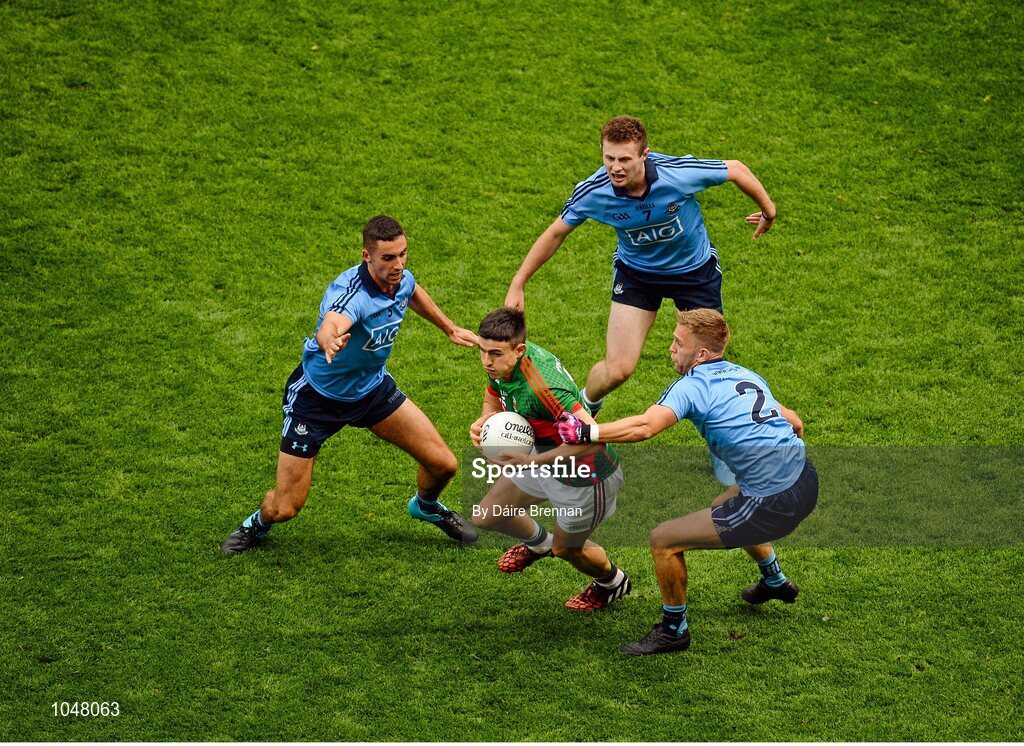 30 August 2015; Jason Doherty, Mayo, in action against Dublin players, left to right, James McCarthy, Jack McCaffrey, and Jonny Cooper. GAA Football All-Ireland Senior Championship, Semi-Final, Dublin v Mayo, Croke Park, Dublin. Picture credit: Dáire Brennan / SPORTSFILE
