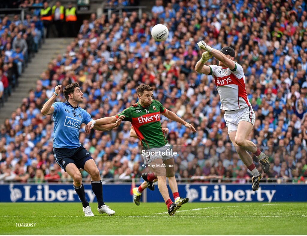 30 August 2015; The Mayo goalkeeper, Rob Hennelly, supported by Chris Barrett, punches clear of Dublin's Bernard Brogan. GAA Football All-Ireland Senior Championship, Semi-Final, Dublin v Mayo, Croke Park, Dublin. Picture credit: Ray McManus / SPORTSFILE