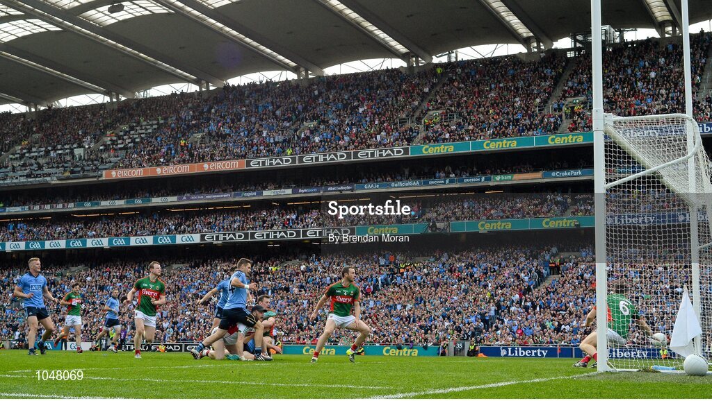 30 August 2015; Chris Barrett, Mayo, fails to stop a shot by Kevin McManamon, 5th from left, Dublin, for Dublin's second goal of the game. GAA Football All-Ireland Senior Championship, Semi-Final, Dublin v Mayo, Croke Park, Dublin. Picture credit: Brendan Moran / SPORTSFILE