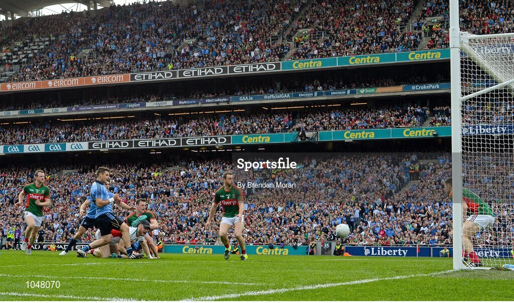 30 August 2015; Kevin McManamon, 2nd from left, Dublin, scores his side's second goal of the game. GAA Football All-Ireland Senior Championship, Semi-Final, Dublin v Mayo, Croke Park, Dublin. Picture credit: Brendan Moran / SPORTSFILE