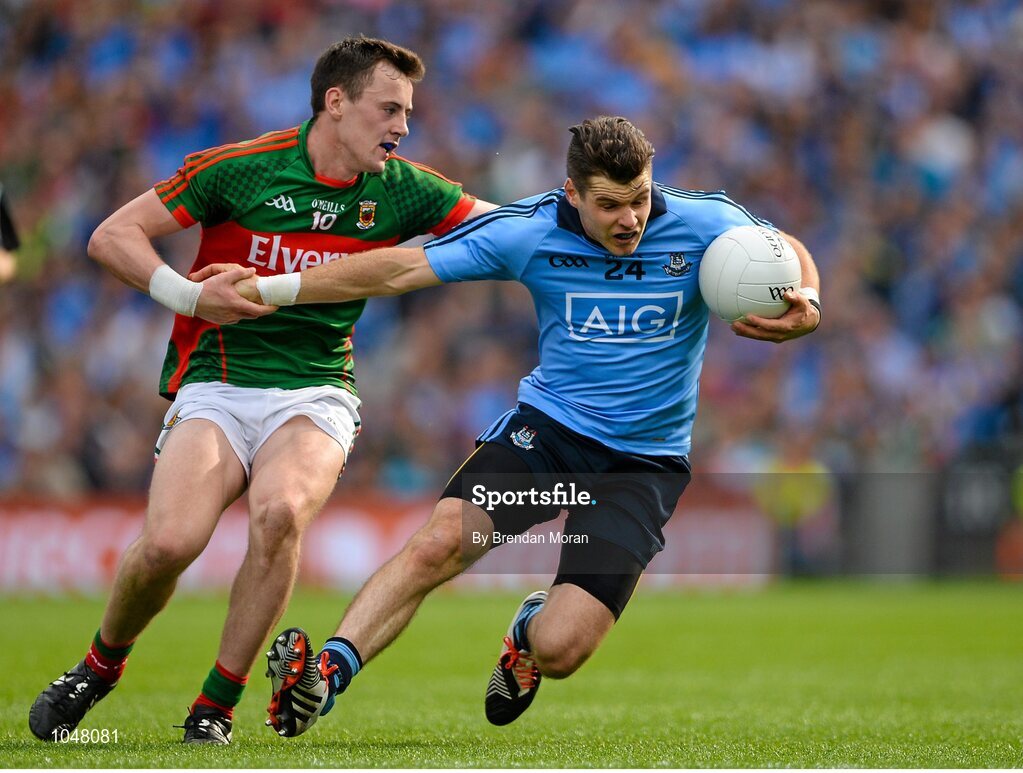 30 August 2015; Kevin McManamon, Dublin, in action against Diarmuid O'Connor, Mayo. GAA Football All-Ireland Senior Championship, Semi-Final, Dublin v Mayo, Croke Park, Dublin. Picture credit: Brendan Moran / SPORTSFILE