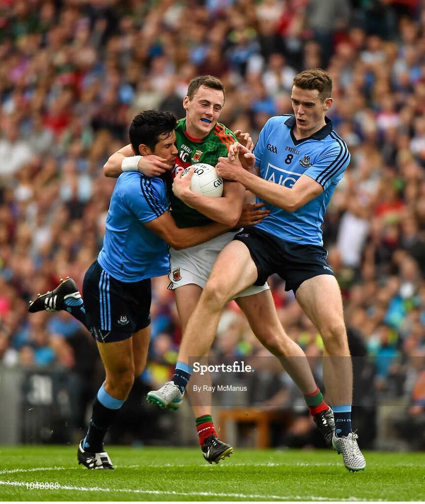 30 August 2015; Diarmuid O'Connor, Mayo, is tackled by Cian O'Sullivan, and Brian Fenton, Dublin. GAA Football All-Ireland Senior Championship, Semi-Final, Dublin v Mayo, Croke Park, Dublin. Picture credit: Ray McManus / SPORTSFILE