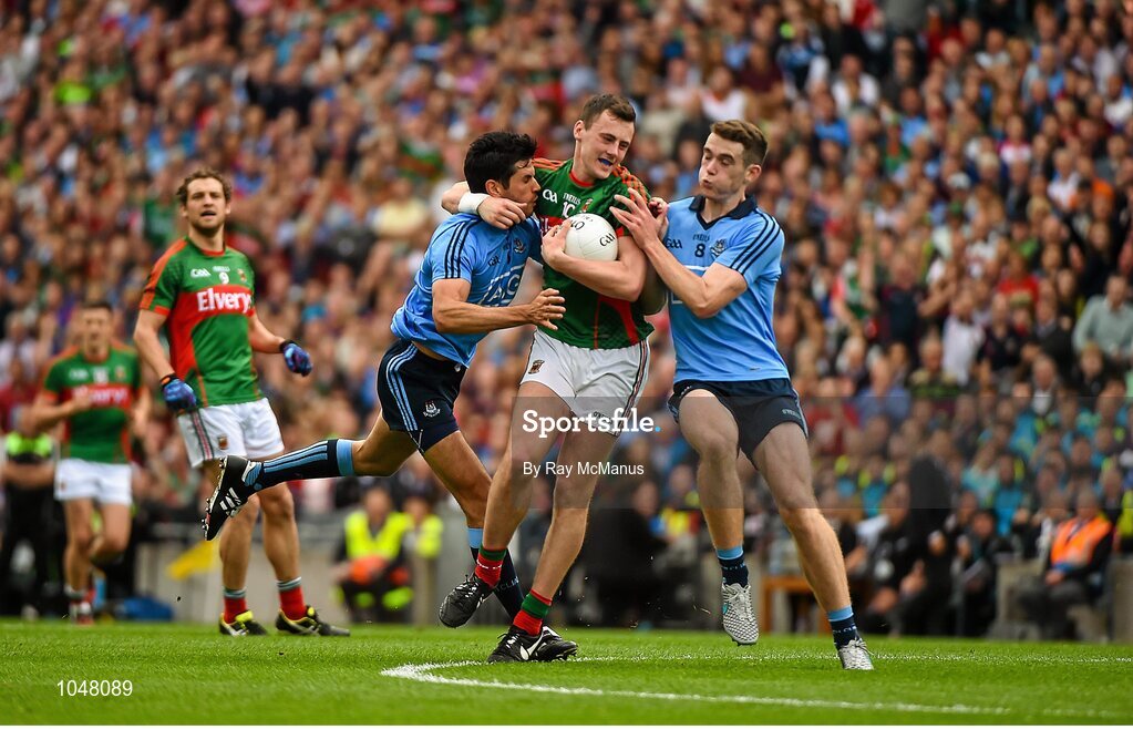 30 August 2015; Diarmuid O'Connor, Mayo, is tackled by Cian O'Sullivan, and Brian Fenton, Dublin. GAA Football All-Ireland Senior Championship, Semi-Final, Dublin v Mayo, Croke Park, Dublin. Picture credit: Ray McManus / SPORTSFILE