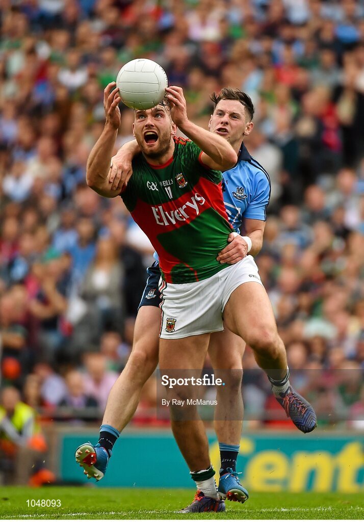 30 August 2015; Aidan O'Shea, Mayo, in action against Philip McMahon, Dublin. GAA Football All-Ireland Senior Championship, Semi-Final, Dublin v Mayo, Croke Park, Dublin. Picture credit: Ray McManus / SPORTSFILE