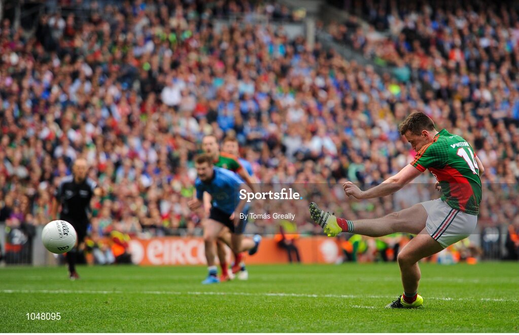 30 August 2015; Cillian O'Connor, Mayo, scores his side's goal from a penalty. GAA Football All-Ireland Senior Championship, Semi-Final, Dublin v Mayo, Croke Park, Dublin. Picture credit: Tomás Greally / SPORTSFILE
