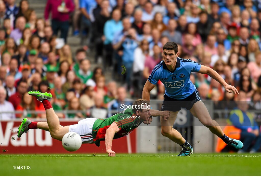 30 August 2015; Diarmuid Connolly, Dublin, in action against Colm Boyle, Mayo. GAA Football All-Ireland Senior Championship, Semi-Final, Dublin v Mayo, Croke Park, Dublin. Photo by Sportsfile