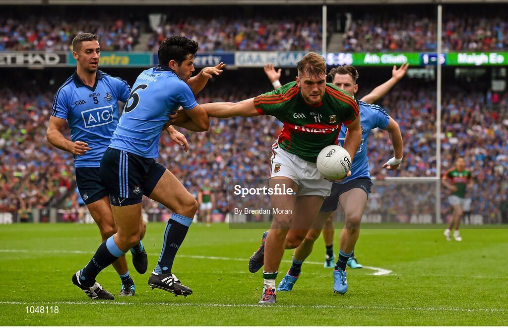 30 August 2015; Aidan O'Shea, Mayo, in action against Dublin players, from left, James McCarthy, Cian O'Sullivan and Philly McMahon. GAA Football All-Ireland Senior Championship, Semi-Final, Dublin v Mayo, Croke Park, Dublin. Picture credit: Brendan Moran / SPORTSFILE