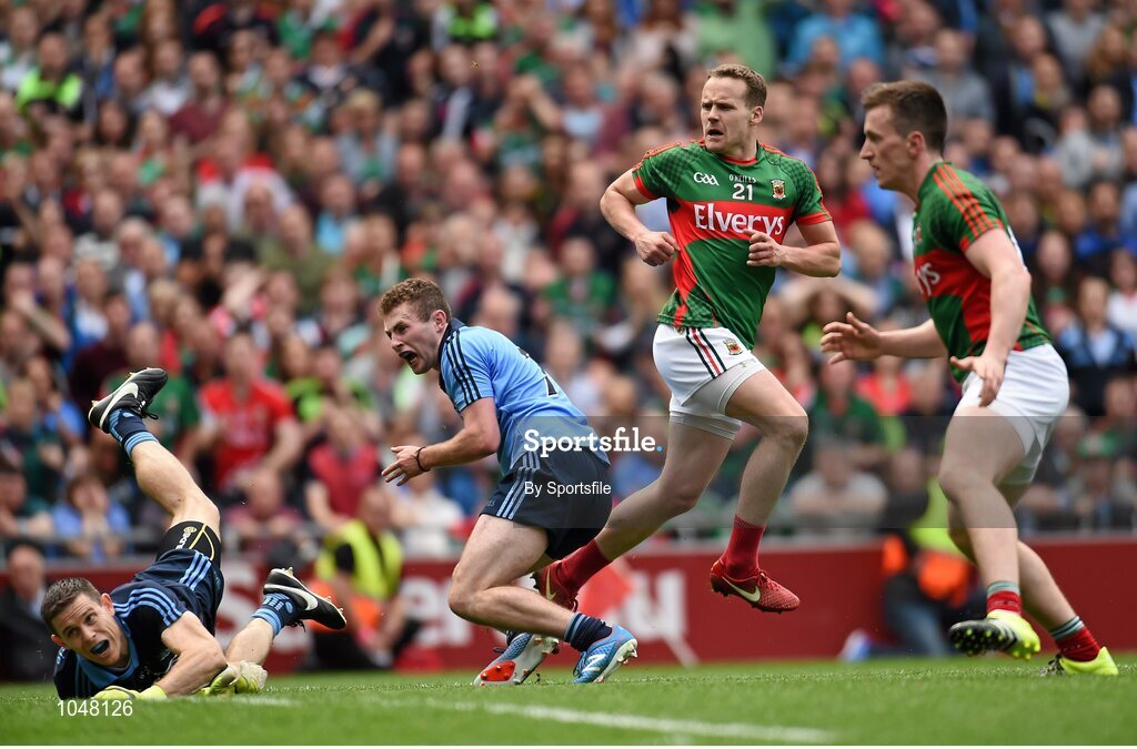 30 August 2015; Dublin goalkeeper Stephen Cluxton and team-mate Jack McCaffrey look on as the shot from Andy Moran, Mayo, 2nd from right, is saved on the line by John Small, Dublin. GAA Football All-Ireland Senior Championship, Semi-Final, Dublin v Mayo, Croke Park, Dublin. Photo by Sportsfile