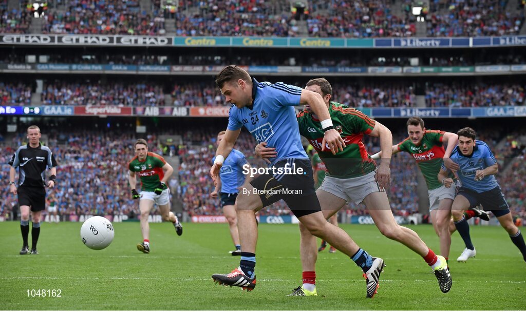 30 August 2015; Kevin McManamon, Dublin, attempts to gets clear of Keith Higgins, Mayo. GAA Football All-Ireland Senior Championship, Semi-Final, Dublin v Mayo, Croke Park, Dublin. Picture credit: Brendan Moran / SPORTSFILE