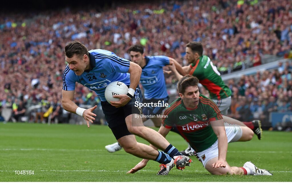 30 August 2015; Kevin McManamon, Dublin, gets clear of Lee Keegan, Mayo. GAA Football All-Ireland Senior Championship, Semi-Final, Dublin v Mayo, Croke Park, Dublin. Picture credit: Brendan Moran / SPORTSFILE