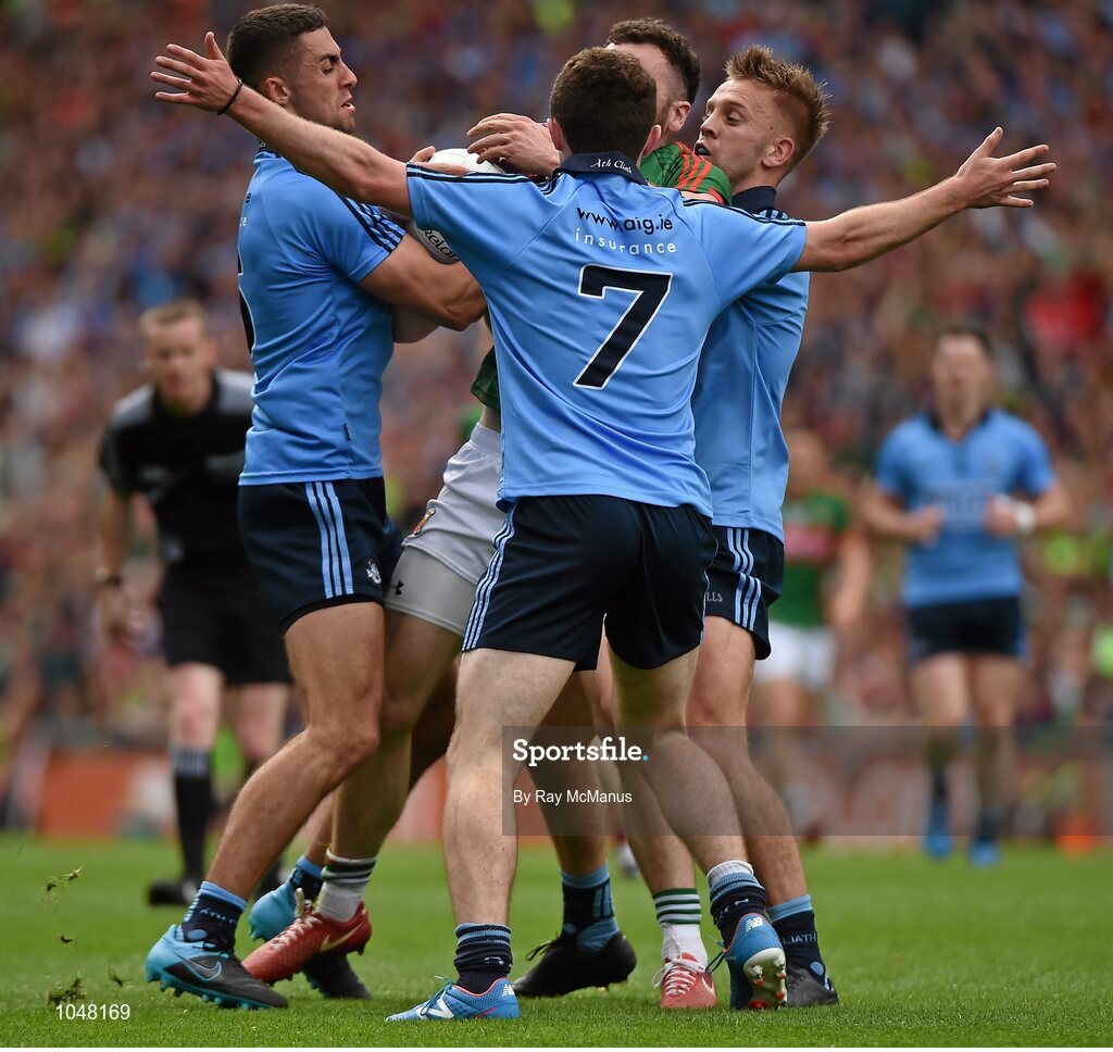 30 August 2015; David Drake, Mayo, in action against James McCarthy, Jack McCaffrey and Jonny Cooper, Dublin. GAA Football All-Ireland Senior Championship, Semi-Final, Dublin v Mayo, Croke Park, Dublin. Picture credit: Ray McManus / SPORTSFILE