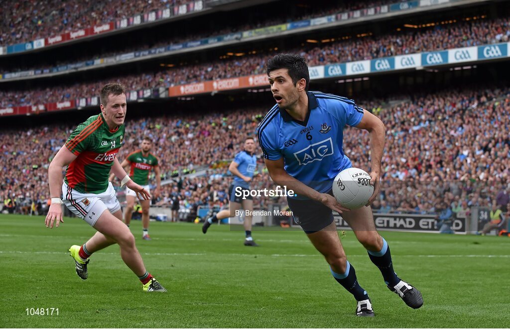 30 August 2015; Cian O'Sullivan, Dublin, in action against Cillian O'Connor, Mayo. GAA Football All-Ireland Senior Championship, Semi-Final, Dublin v Mayo, Croke Park, Dublin. Picture credit: Brendan Moran / SPORTSFILE