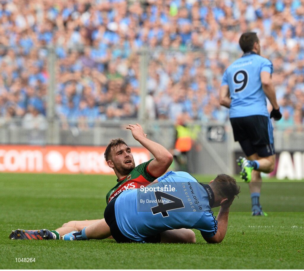 30 August 2015; Philip McMahon, Dublin, and Aidan O'Shea, Mayo, clash heads. GAA Football All-Ireland Senior Championship, Semi-Final, Dublin v Mayo, Croke Park, Dublin. Picture credit: David Maher / SPORTSFILE