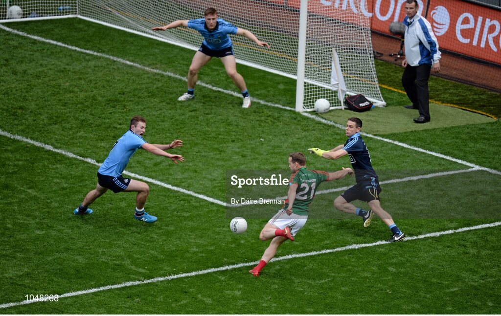 30 August 2015; Andy Moran, Mayo, takes a shot on goal that was saved on the line by John Small, Dublin. GAA Football All-Ireland Senior Championship, Semi-Final, Dublin v Mayo, Croke Park, Dublin. Picture credit: Dáire Brennan / SPORTSFILE