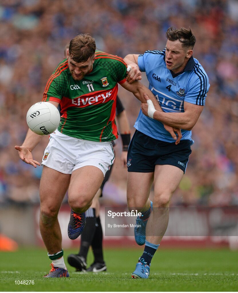 30 August 2015; Aidan O'Shea, Mayo, in action against Philly McMahon, Dublin. GAA Football All-Ireland Senior Championship, Semi-Final, Dublin v Mayo, Croke Park, Dublin. Picture credit: Brendan Moran / SPORTSFILE