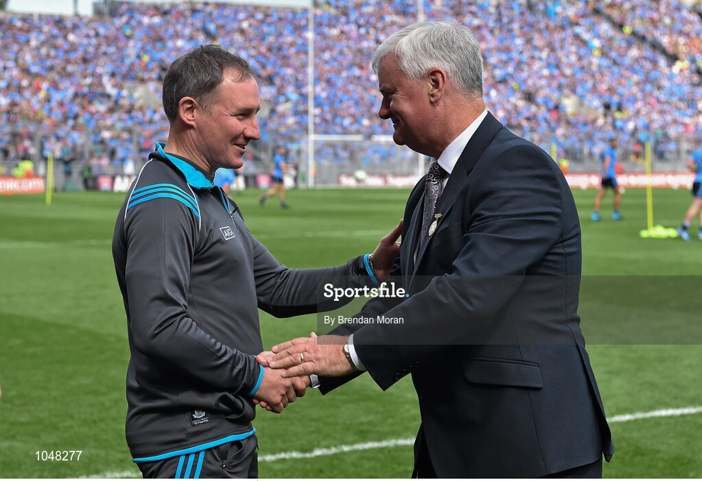 30 August 2015; Dublin manager Jim Gavin and Uachtarán Chumann Lúthchleas Gael Aogán Ó Fearghail greet each other as they pass by ahead of the game. GAA Football All-Ireland Senior Championship, Semi-Final, Dublin v Mayo, Croke Park, Dublin. Picture credit: Brendan Moran / SPORTSFILE