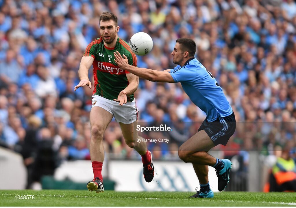 30 August 2015; Séamus O'Shea, Mayo, in action against James McCarthy, Dublin. GAA Football All-Ireland Senior Championship, Semi-Final, Dublin v Mayo, Croke Park, Dublin. Picture credit: Ramsey Cardy / SPORTSFILE