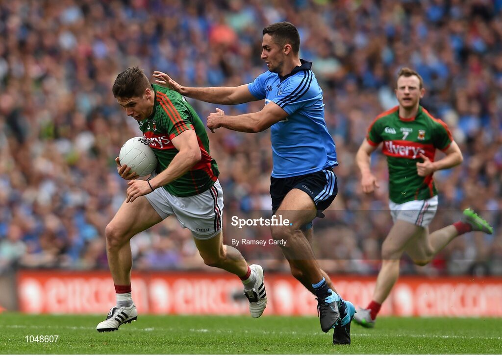 30 August 2015; Lee Keegan, Mayo, is tackled by James McCarthy, Dublin. GAA Football All-Ireland Senior Championship, Semi-Final, Dublin v Mayo, Croke Park, Dublin. Picture credit: Ramsey Cardy / SPORTSFILE