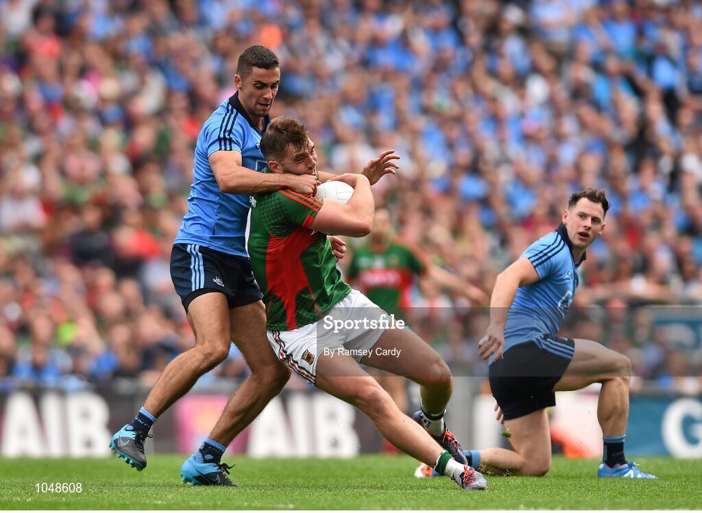 30 August 2015; Aidan O'Shea, Mayo, is tackled by James McCarthy, Dublin. GAA Football All-Ireland Senior Championship, Semi-Final, Dublin v Mayo, Croke Park, Dublin. Picture credit: Ramsey Cardy / SPORTSFILE