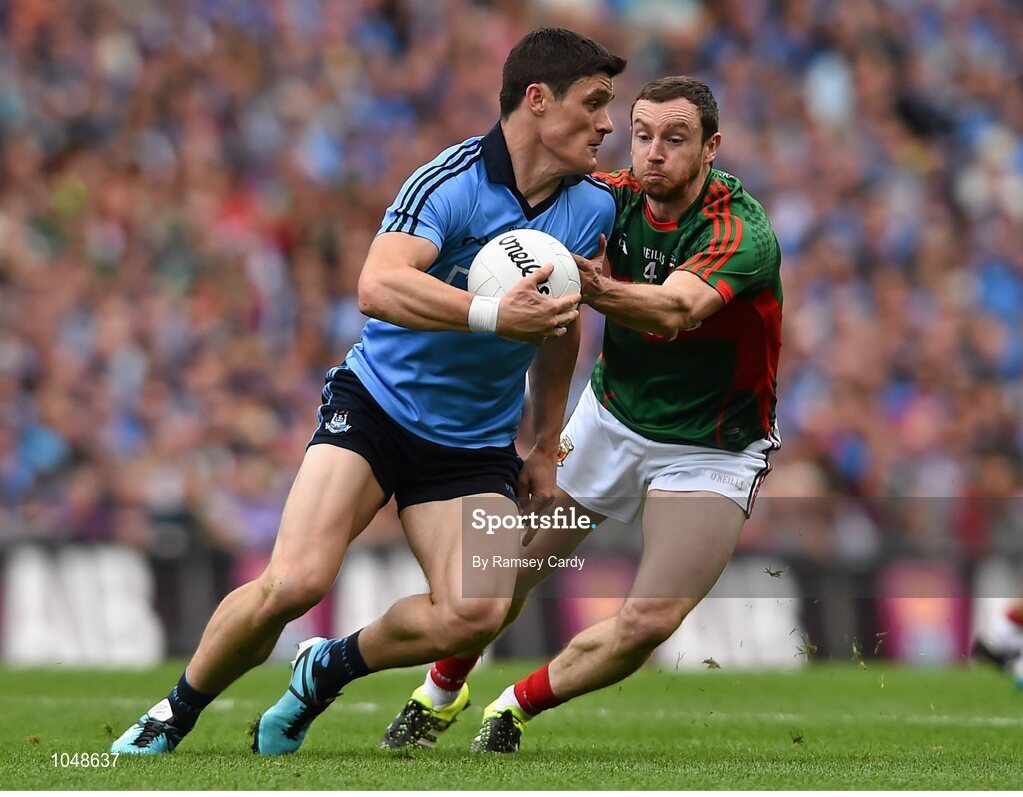 30 August 2015; Diarmuid Connolly, Dublin, is tackled by Keith Higgins, Mayo. GAA Football All-Ireland Senior Championship, Semi-Final, Dublin v Mayo, Croke Park, Dublin. Picture credit: Ramsey Cardy / SPORTSFILE